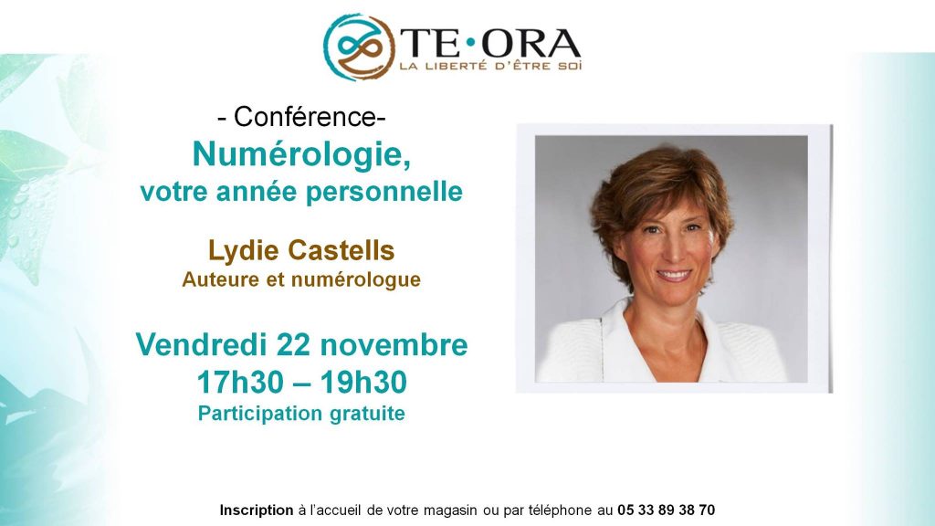 A l’occasion de la sortie de son 3ème livre « Numérologie, votre année personnelle », co-écrit avec Didier Durandy, Lydie Castells donnera une conférence le 22 novembre à 17h30 à la Librairie TE ORA pour vous permettre de découvrir les enjeux principaux de votre année personnelle 2020.