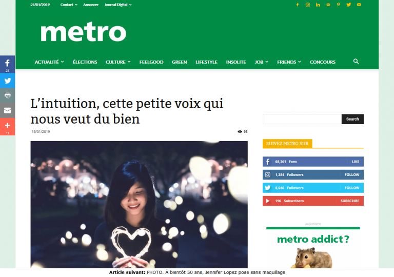 Interview du magazine Belge Metro sur l’intuition