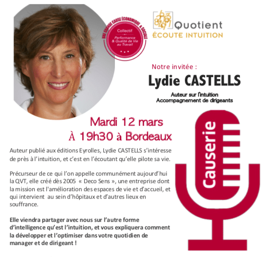 Mardi 12 mars, Lydie CASTELLS, auteur du livre « Intuition, et si on l’écoutait vraiment ? » nous parlera de l’intuition. Lydie Castells explique que tout le